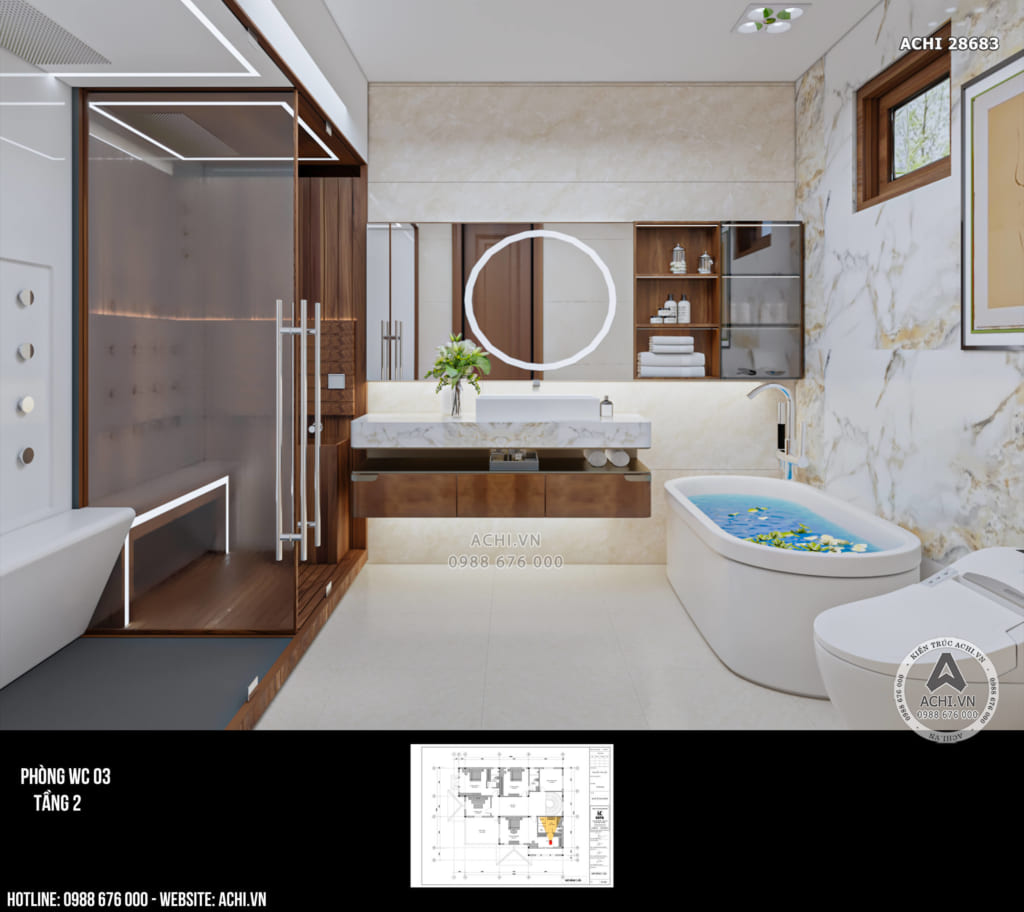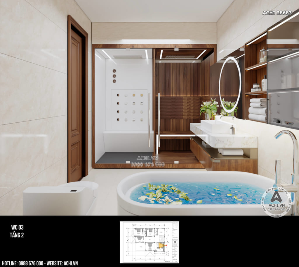 Mẫu thiết kế nội thất ACHI 28683 được xây dựng theo phong cách hiện đại, hướng đến sự tối giản nhưng vẫn đảm bảo sự sang trọng và tinh tế. Không gian nội thất được bố trí khoa học, hạn chế chi tiết rườm rà, tập trung vào đường nét gọn gàng, dứt khoát.