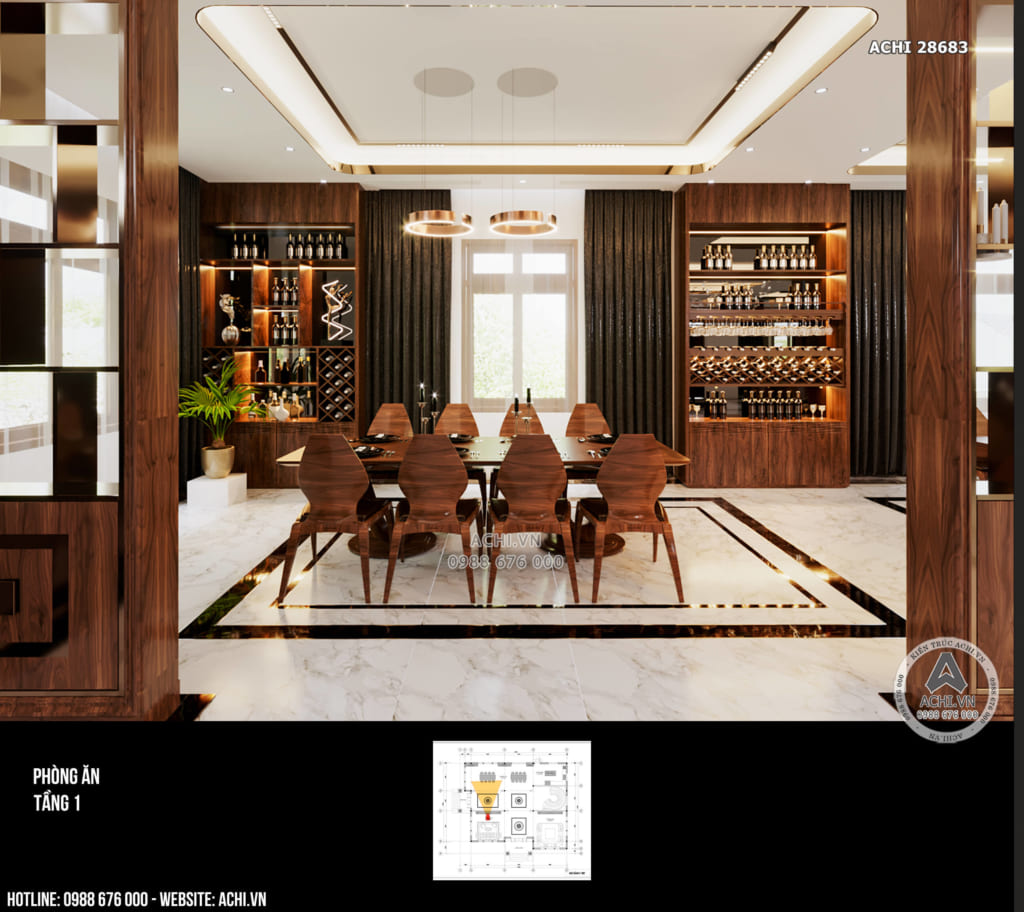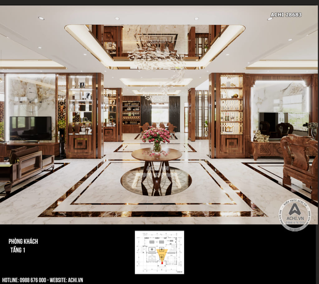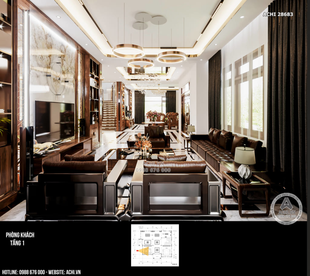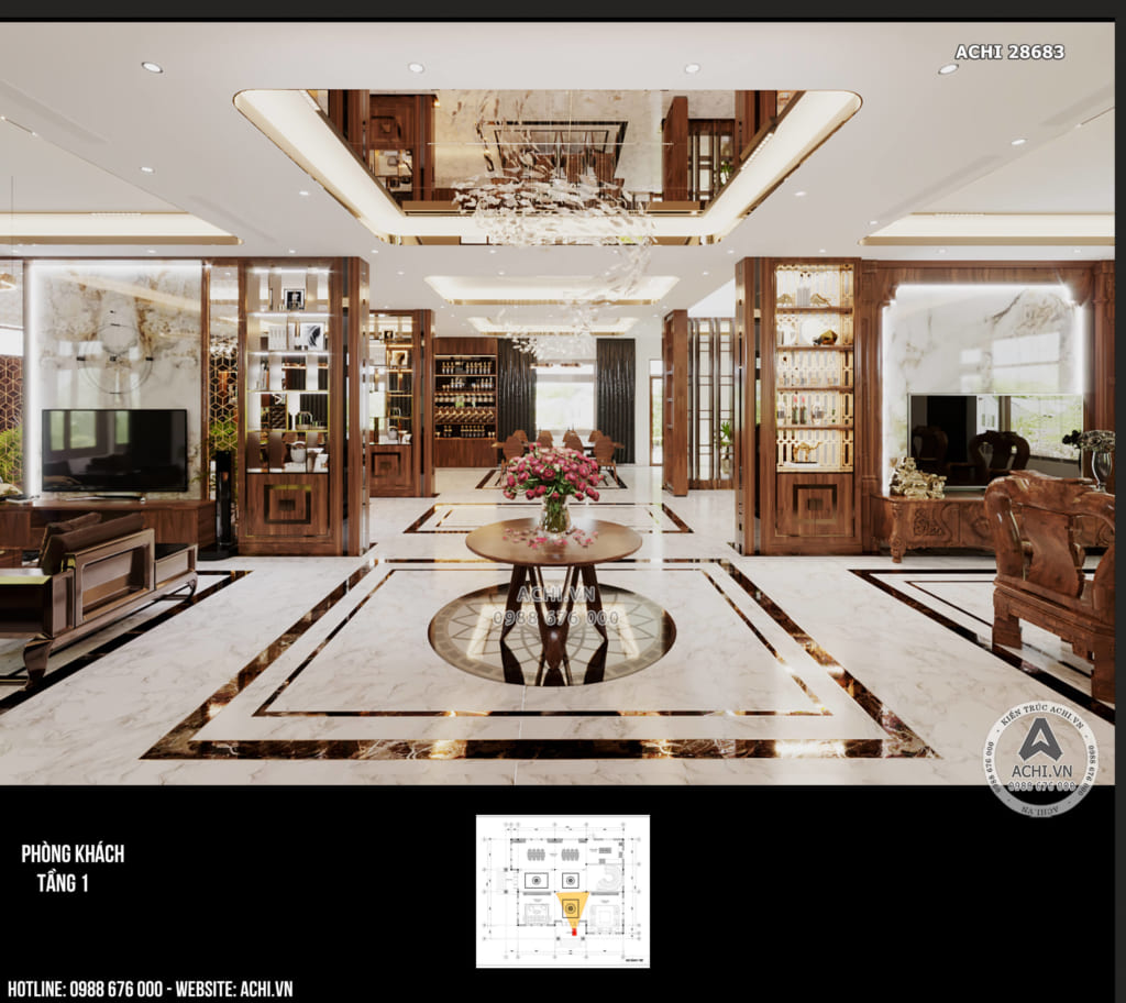 Không gian tầng 1 trong mỗi ngôi nhà không chỉ là nơi đón tiếp khách, mà còn là “bộ mặt” của tổng thể kiến trúc, là nơi diễn ra phần lớn các sinh hoạt chung của gia đình. Hiểu rõ vai trò đó, mẫu thiết kế ACHI-28683 được các kiến trúc sư của ACHI nghiên cứu kỹ lưỡng từ tỷ lệ không gian, sự luân chuyển ánh sáng đến từng chi tiết nội thất nhỏ nhất. Dưới đây là sự diễn giải chi tiết từng lớp lang ý tưởng, giúp bạn hình dung rõ nhất vì sao mẫu thiết kế này lại trở thành lựa chọn lý tưởng cho không gian phòng khách tầng 1.