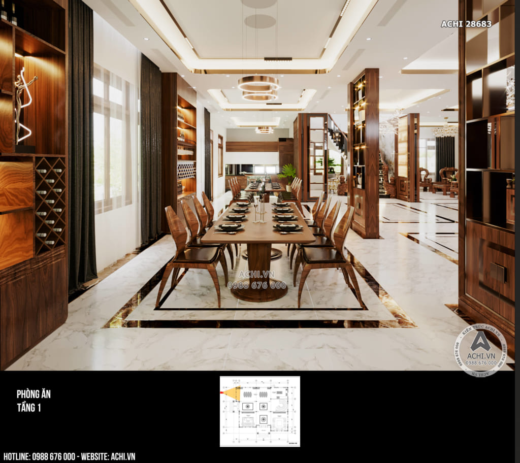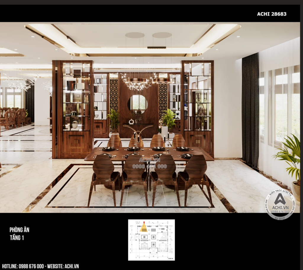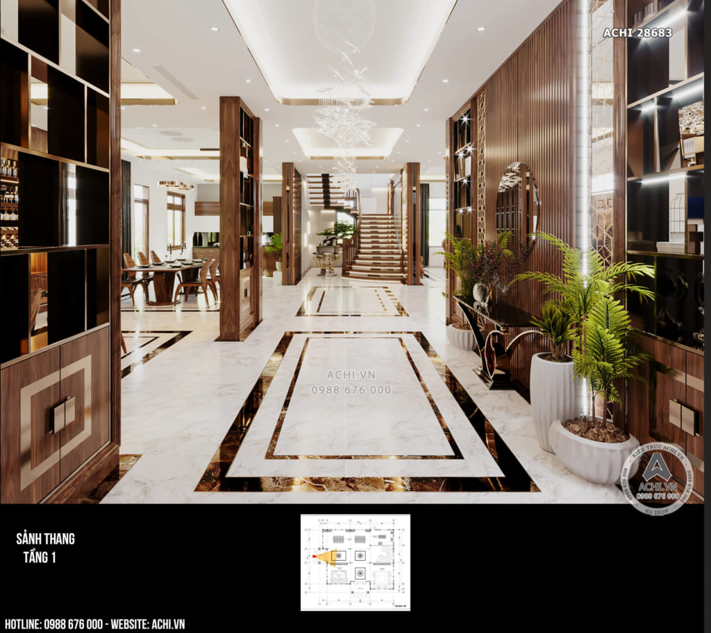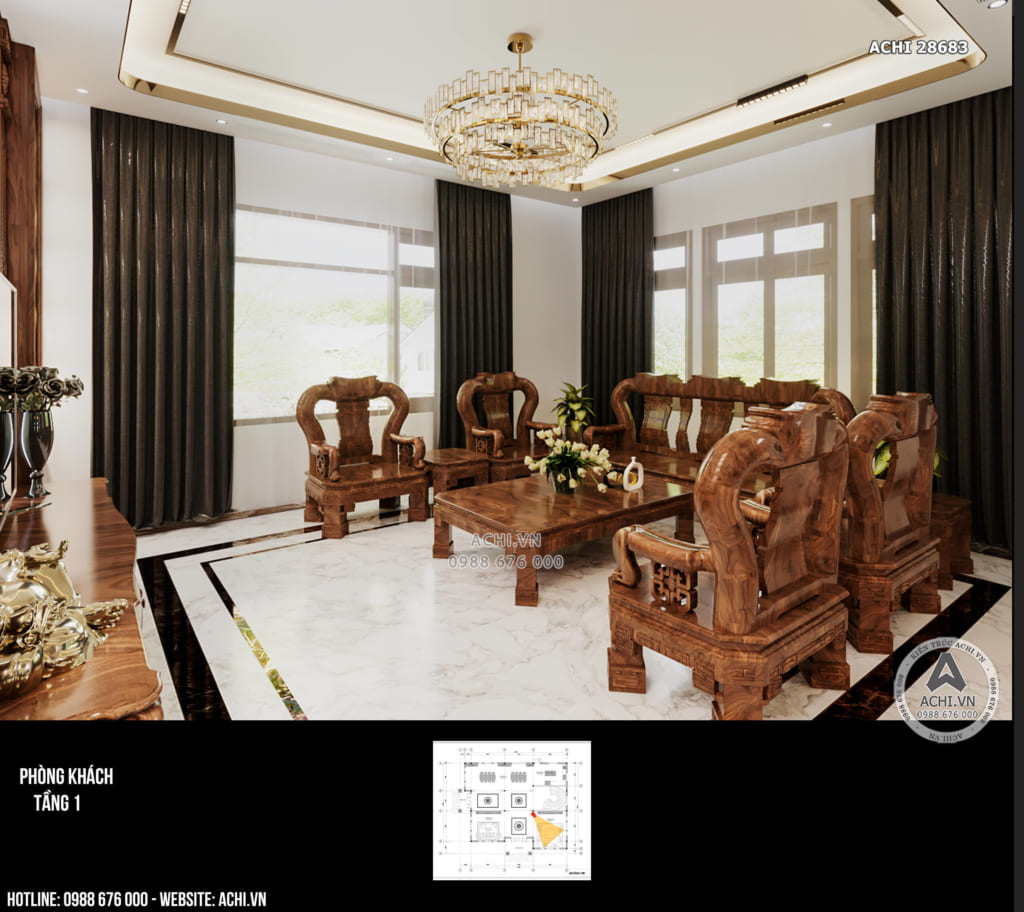 Không gian tầng 1 trong mỗi ngôi nhà không chỉ là nơi đón tiếp khách, mà còn là “bộ mặt” của tổng thể kiến trúc, là nơi diễn ra phần lớn các sinh hoạt chung của gia đình. Hiểu rõ vai trò đó, mẫu thiết kế ACHI-28683 được các kiến trúc sư của ACHI nghiên cứu kỹ lưỡng từ tỷ lệ không gian, sự luân chuyển ánh sáng đến từng chi tiết nội thất nhỏ nhất. Dưới đây là sự diễn giải chi tiết từng lớp lang ý tưởng, giúp bạn hình dung rõ nhất vì sao mẫu thiết kế này lại trở thành lựa chọn lý tưởng cho không gian phòng khách tầng 1.