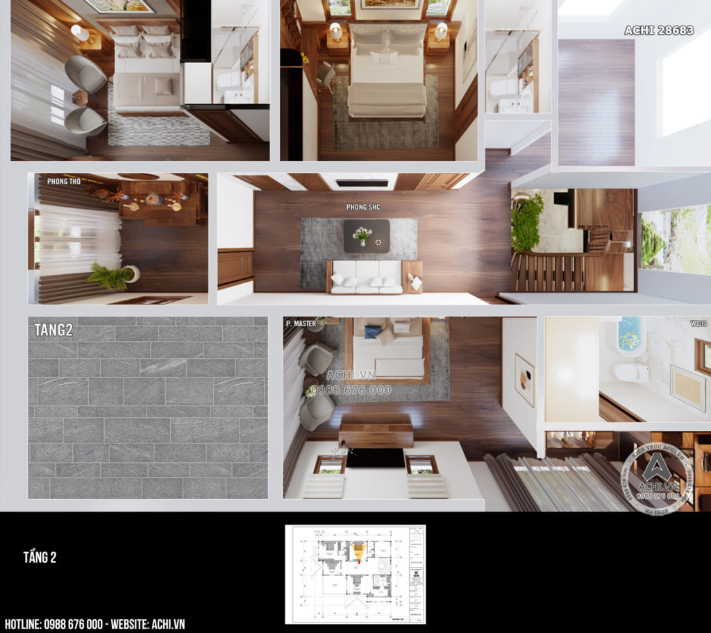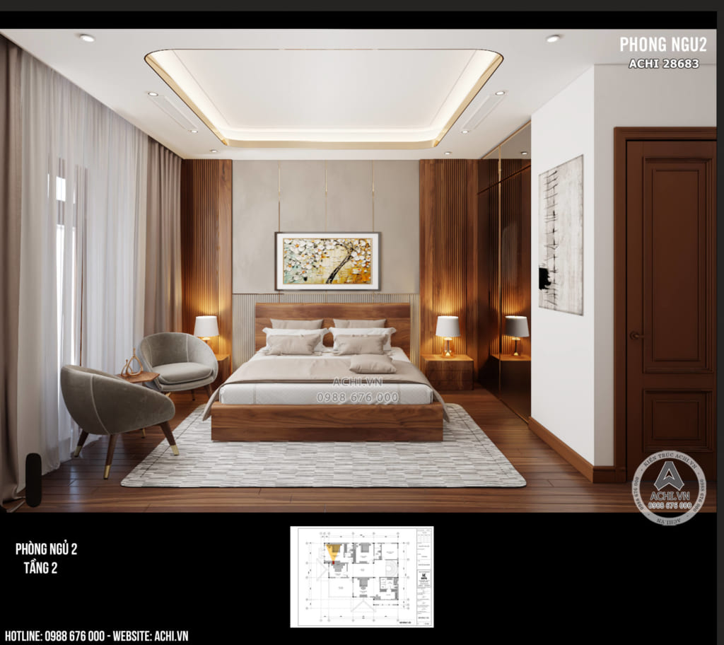 ACHI 28683 không chỉ là một phòng ngủ thông thường. Được bố trí tại tầng 2 – vị trí vàng trong kiến trúc nhà ở hiện đại – căn phòng này đảm bảo sự riêng tư tuyệt đối, tách biệt khỏi không gian sinh hoạt chung ồn ào ở tầng một, đồng thời tận dụng tối đa ánh sáng tự nhiên và gió trời. Đối với những ngôi nhà phố hay biệt thự, tầng hai thường được dành riêng cho những không gian nghỉ ngơi mang đậm dấu ấn cá nhân. Và ACHI 28683 ra đời để đáp ứng đúng điều đó: vừa kín đáo, an toàn, vừa tràn ngập sinh khí từ thiên nhiên.