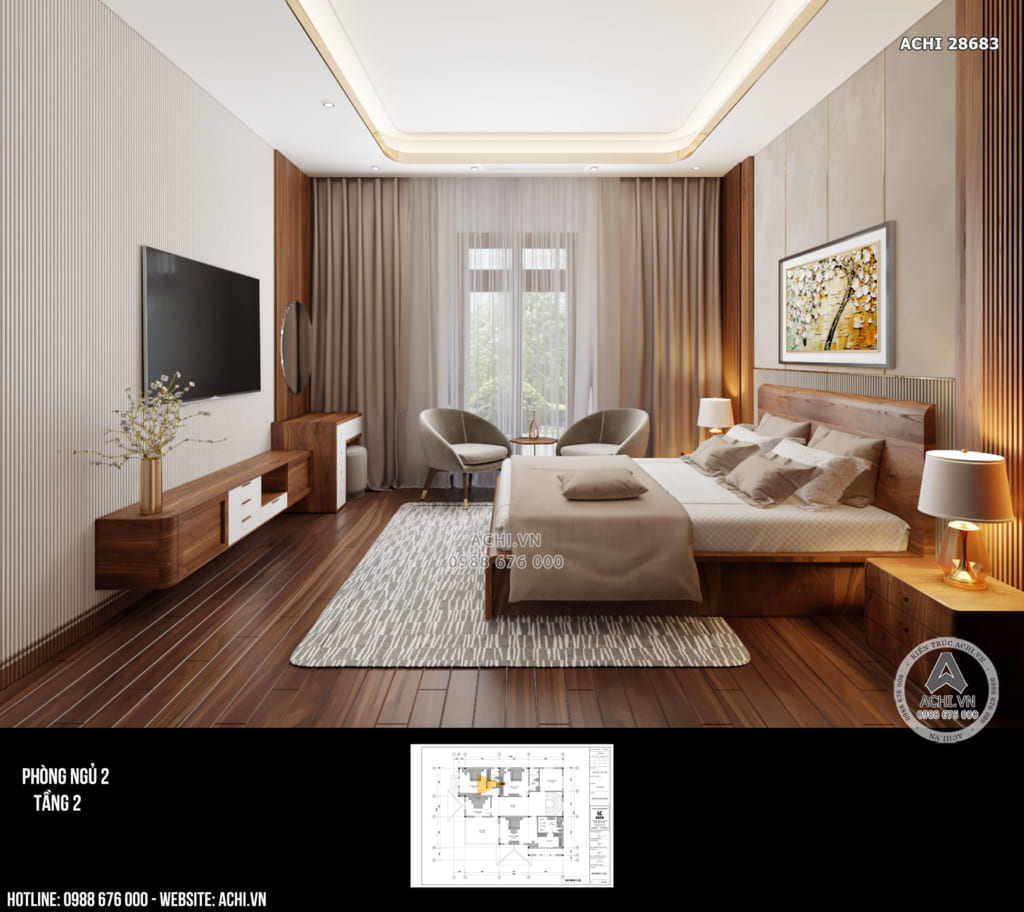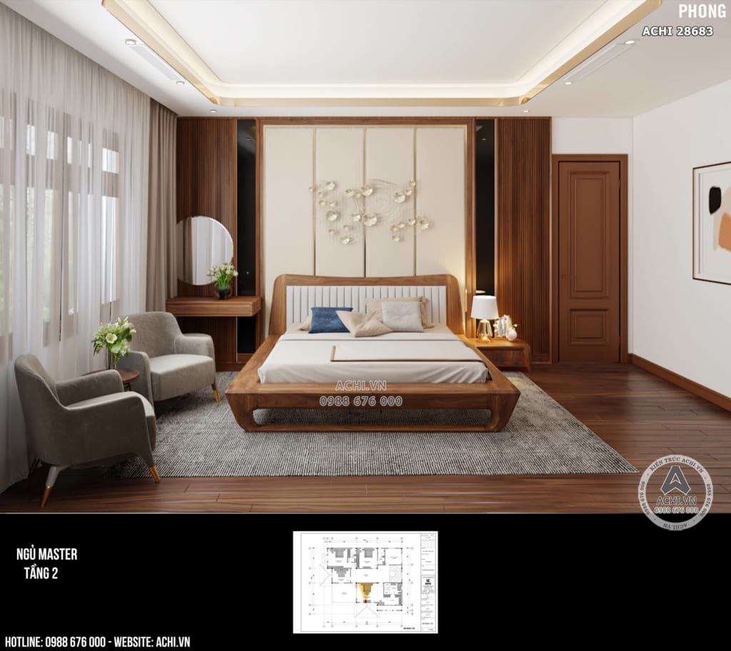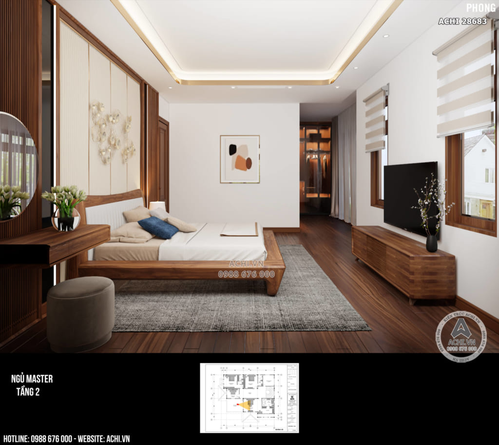 Có thể nói, phòng ngủ ACHI 28683 không chỉ là một không gian để ngủ, mà là nơi nuôi dưỡng những giá trị tinh thần. Ở đó, bạn có thể bắt đầu ngày mới bằng tách cà phê bên khung cửa sổ tầng hai đón nắng, hay kết thúc một ngày bằng những phút giây thư giãn dưới ánh đèn vàng ấm áp. Sự kết hợp hài hòa giữa màu sắc, chất liệu và bố cục không gian khiến căn phòng trở thành một nơi trú ẩn lý tưởng, nơi bạn thực sự là chính mình.